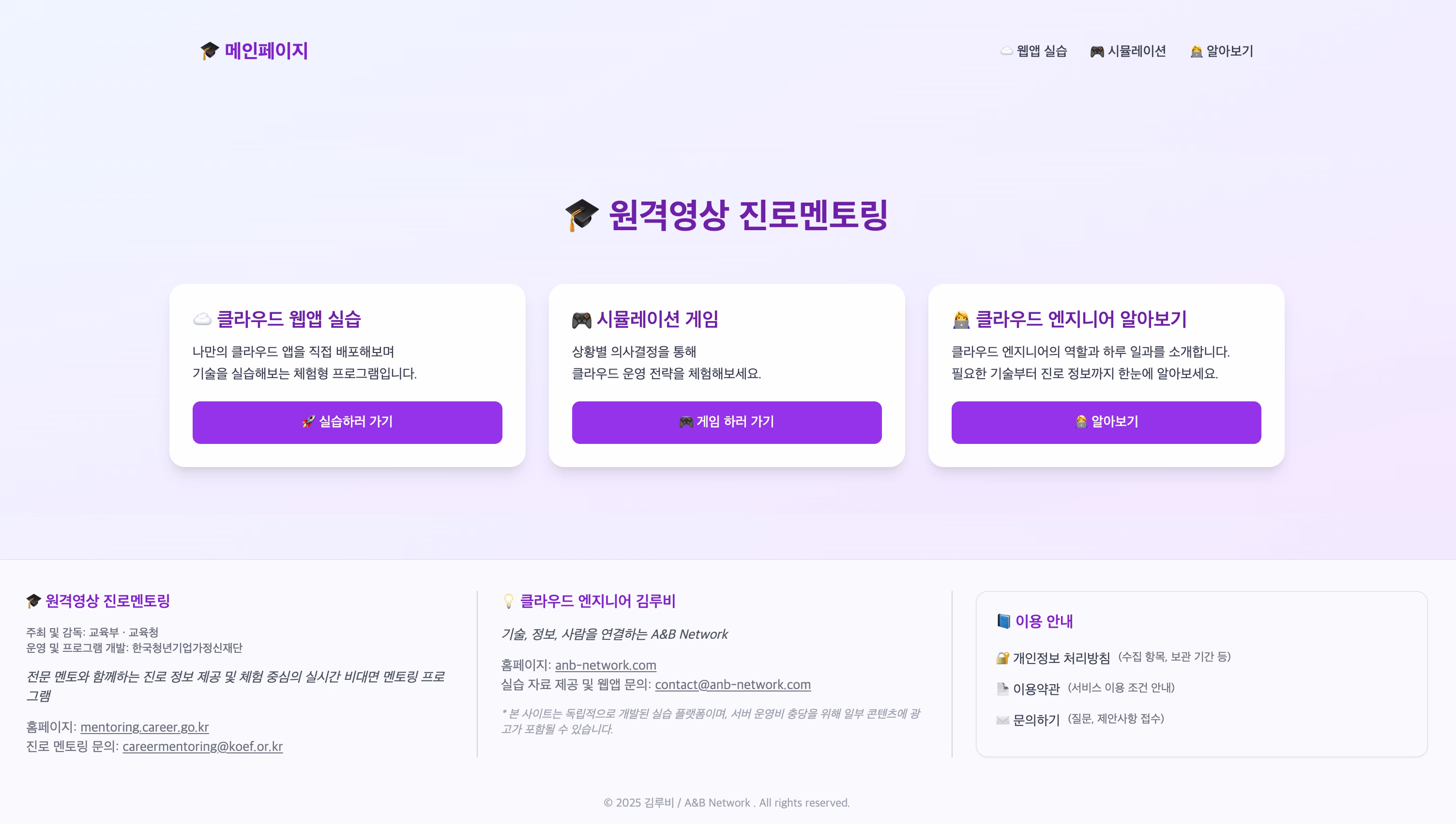 Diese Plattform wurde im Rahmen des vom koreanischen Bildungsministerium unterstützten Remote-Karriere-Mentoring-Programms entwickelt und soll Schülern helfen, die Rolle eines Cloud-Ingenieurs aus erster Hand zu erfahren.