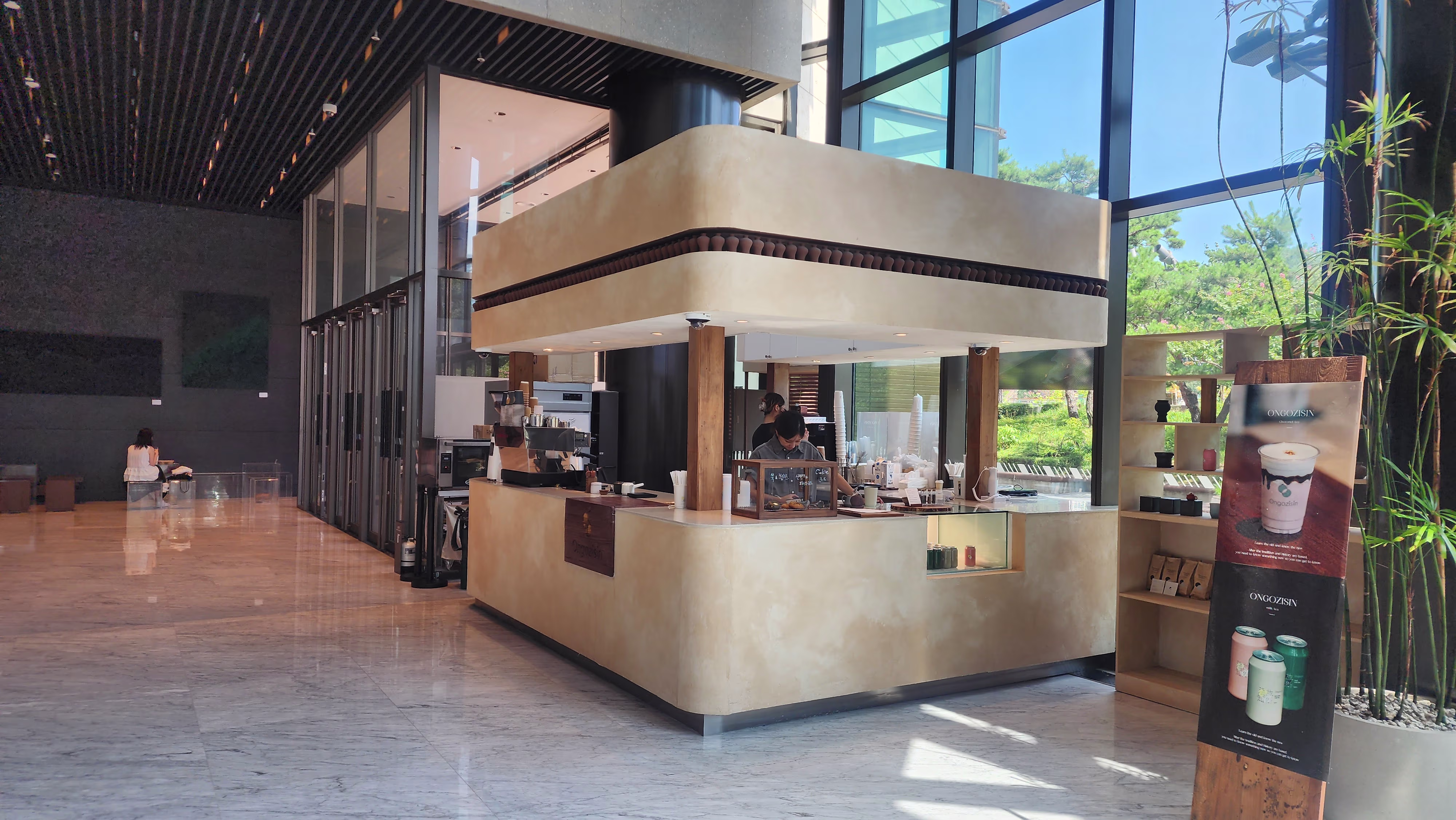 Ongojisin D-Cube Office est niché dans un petit espace à l’intérieur du bâtiment. Contrairement aux cafés typiques, il offre une ambiance de salon de bureau calme et bien rangée.